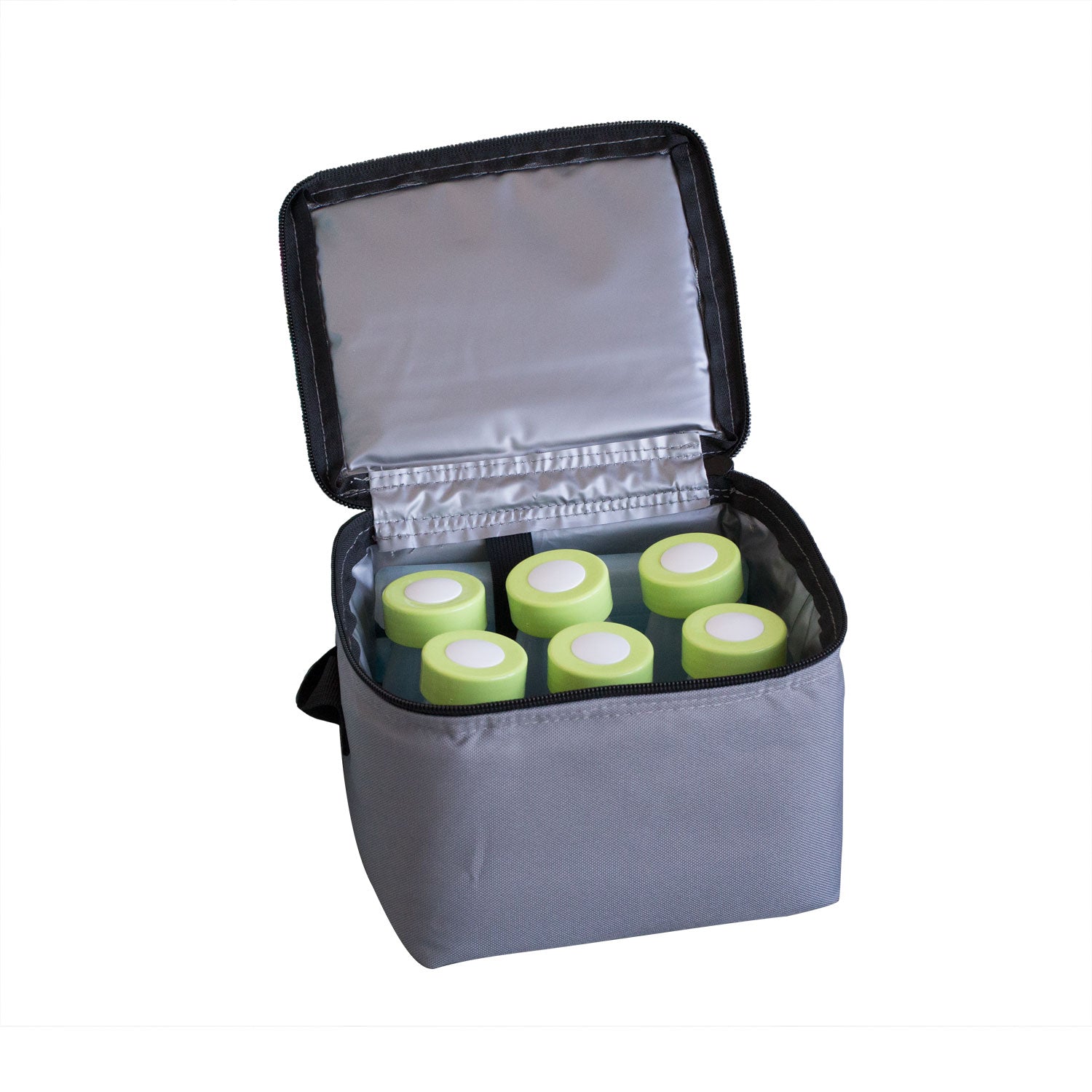 Această geantă este concepută pentru a transporta șase recipiente de stocare a laptelui matern Ardo, iar căptușeala sa rezistentă și izolată termic menține laptele la o temperatură optimă.